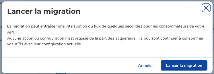 Un dernier avertissement vous informe que vos acquéreurs de données pourront observer une interruption de service de l’ordre de quelques secondes, mais n’auront aucune manipulation à réaliser pour continuer à consommer les APIs acquises.