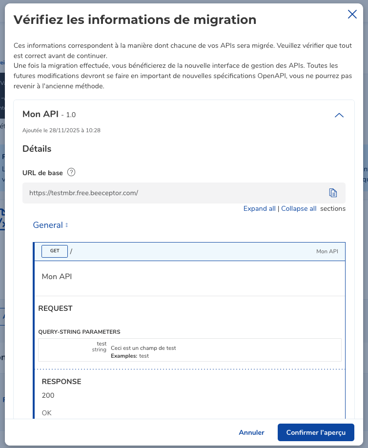 dans le cas contraire, une erreur est affichée, vous indiquant que votre/vos APIs n’ont pas pu être migrées.