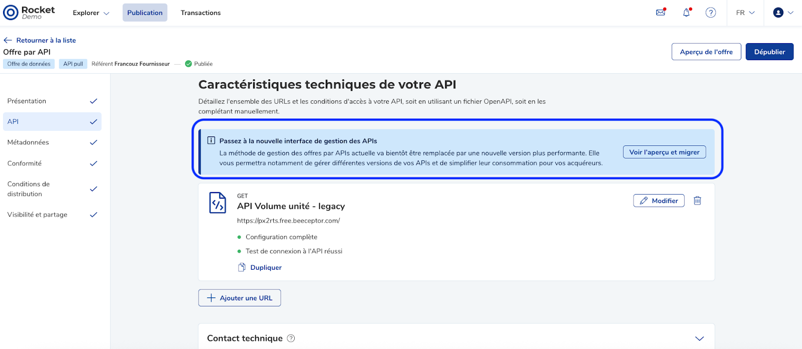 Vous pourrez alors visualiser la/les APIs configurées dans votre offre de données, dans le nouveau format.